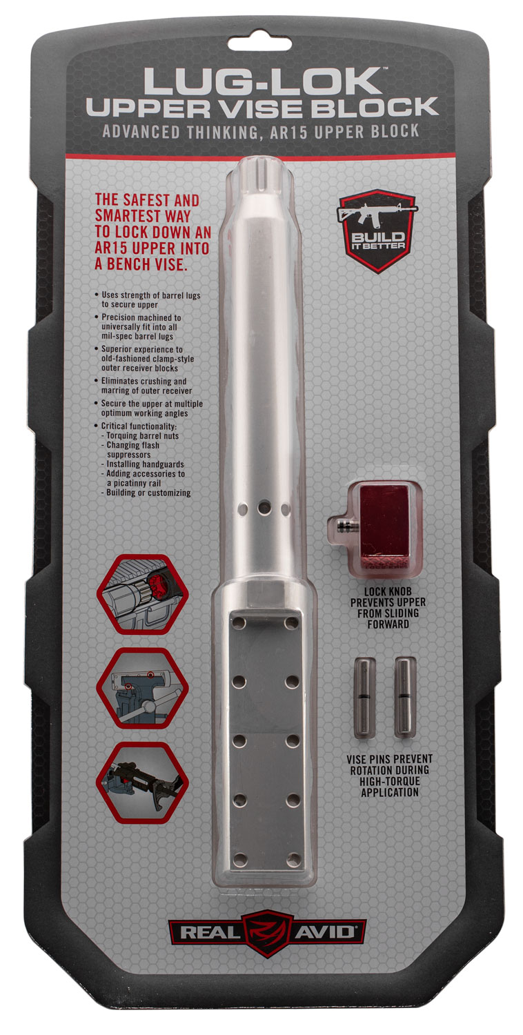 The Lug-Lok Upper Vise block uses the strength of barrel lugs to safely secure AR15 upper receivers while you work, rendering clamp-style blocks obsolete. The non-marring, aircraft-grade aluminum block slides through the upper receiver and into the star chamber of your barrel. This takes the pressure from torquing away from weak, damage prone parts and puts it squarely on the steel lugs. Adjustable Vise Pins hold the block at the optimal working angle and the Lock Knob ensures the upper receiver stays exactly where you want it.
